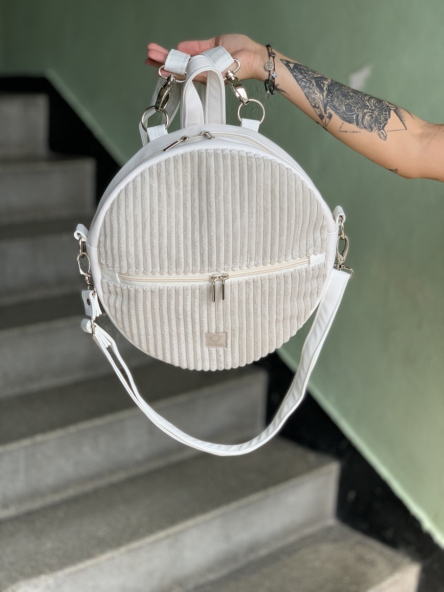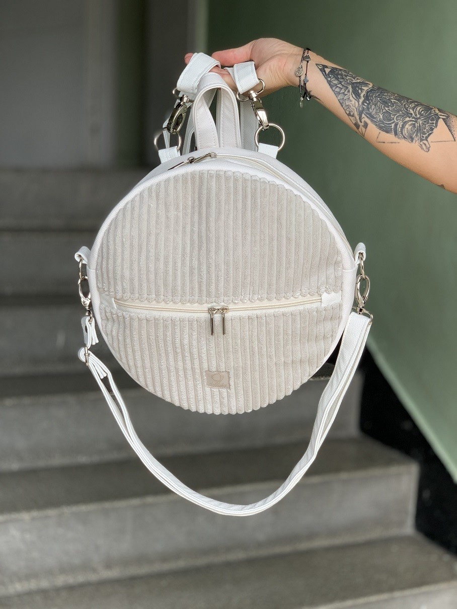 Materiał: sztruks tapicerski w kolorze beżowym; biała ecoskóra. Plecak zapinany jest na zamek błyskawiczny. Z przodu i z tyłu: duże kieszonki na zamek.