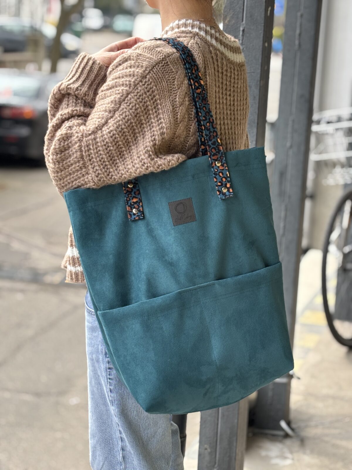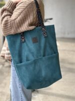 Materiały tapicerskie: zamsz w kolorze ciemnego turkusu. Torebka zapinana jest na zamek błyskawiczny. Z przodu: otwarte kieszonki.